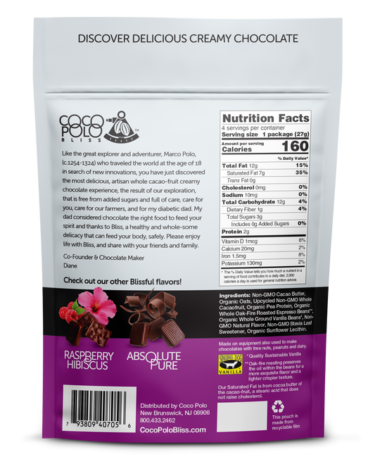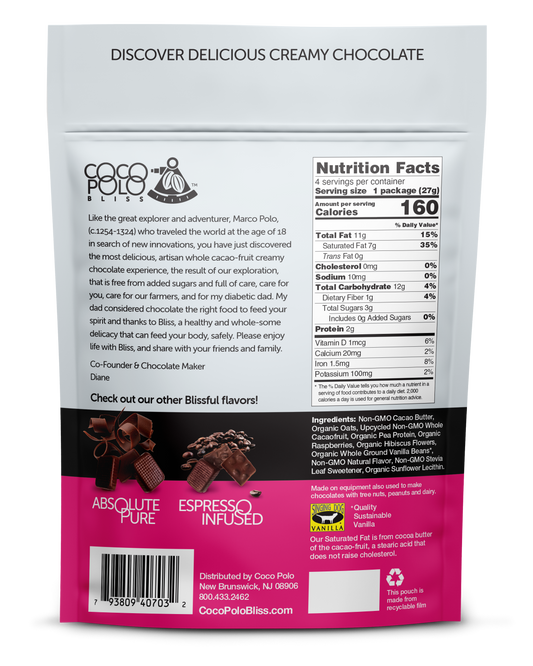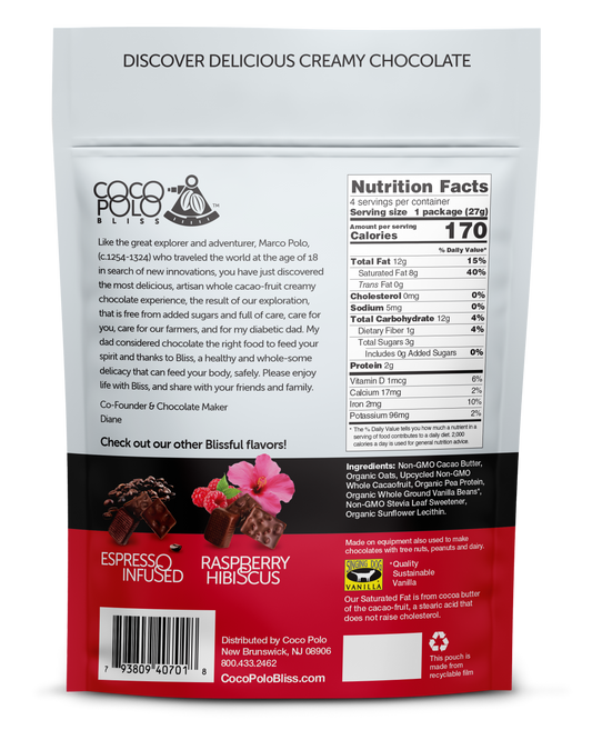 True to Coco Polo’s line of premium quality cacao chocolates, our newly created chocolate line Coco Polo bliss™ is made without added sugars of any kind. The natural sweetness and fruitiness of the whole cacao fruit combined with a faint sweetness boost (without adding the taste) from our non GMO Stevia, is all Coco Polo bliss™ needs.